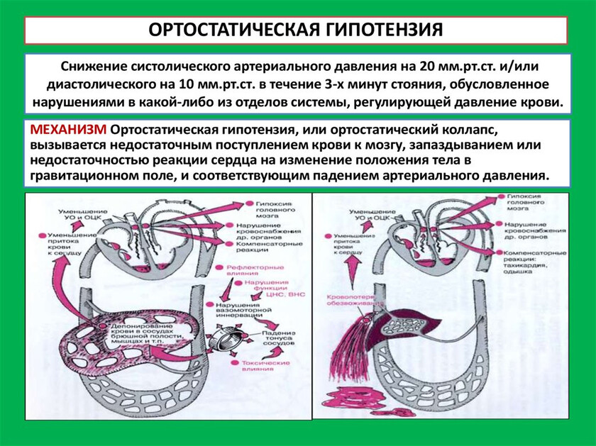 Ортостатическая, или постуральная гипотензия — это резкое снижение артериального давления в вертикальном положении тела. Верхний и нижний показатели в течение нескольких секунд могут «прыгнуть» вниз на 10–20 мм. рт. ст.